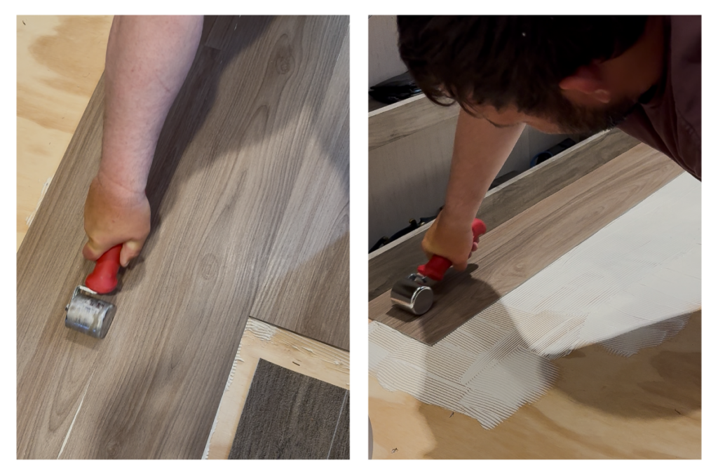 So basically, you’ll apply the glue down for your flooring, set the flooring, then roll it out!
