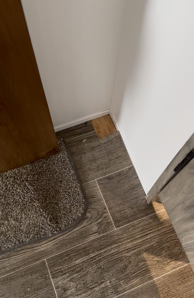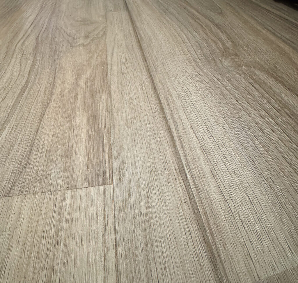 For a minute, my husband thought his work did go to waste, but when we warmed the camper back up, the flooring contracted back and we didn’t see the tiny cracks between the vinyl flooring anymore.